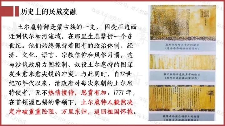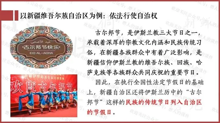 本课通过民族知识抢答游戏导入,激发学生兴趣;通过梳理历史上的民族交融故事,追溯制度确立的历史必然性;以新疆维吾尔自治区为例,生动展示自治权在立法、经济、文化等领域的具体行使,帮助学生理解制度的核心内容;通过对比民族地区发展的今昔变迁,深刻揭示制度对于维护国家统一、促进民族团结、实现共同繁荣的重大意义。课件逻辑严谨,案例鲜活,在知识传授的同时,有效铸牢学生的中华民族共同体意识,坚定制度自信。