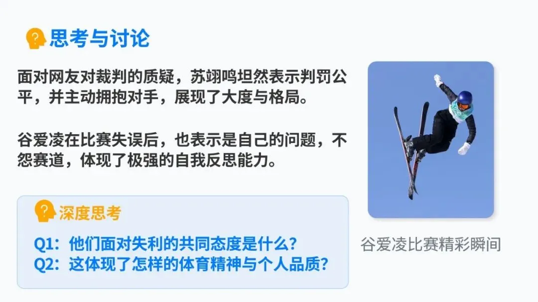 1.教师活动:展示谷爱凌比赛失误后反思自身问题、不怨赛道的素材,提出深度思考问题: