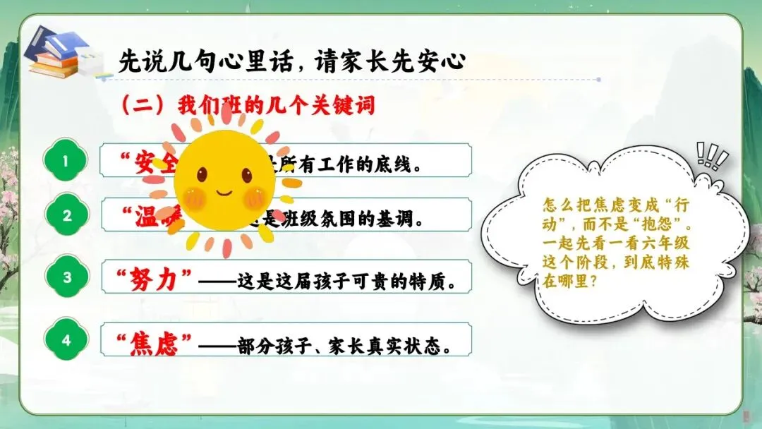 各位家长,六年级下学期和以往的年级不同,孩子从“高年级” 正式进入 “毕业班”,这是一个重要的关键拐点,孩子的身体、心理、学习都会发生一系列明显的变化。首先我想先和大家交个底,说说孩子们在学校的整体状态,给大家吃一颗 “定心丸”。