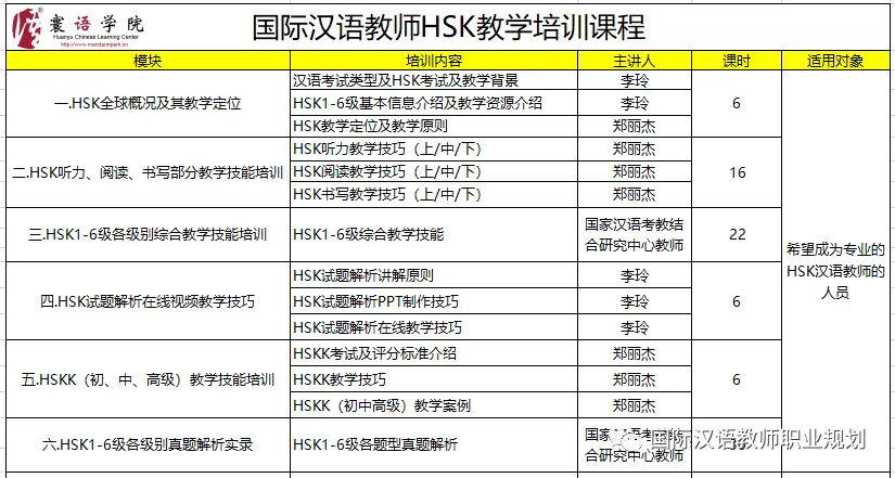 授课内容包括HSK全球概况及教学定位、HSK听力、阅读及书写各部分教学技能、HSK1~6级各级别综合教学技能、HSK试题解析在线教学技巧、HSKK(初、中、高)教学技能、HSK1~6级各级别真题解析实录。