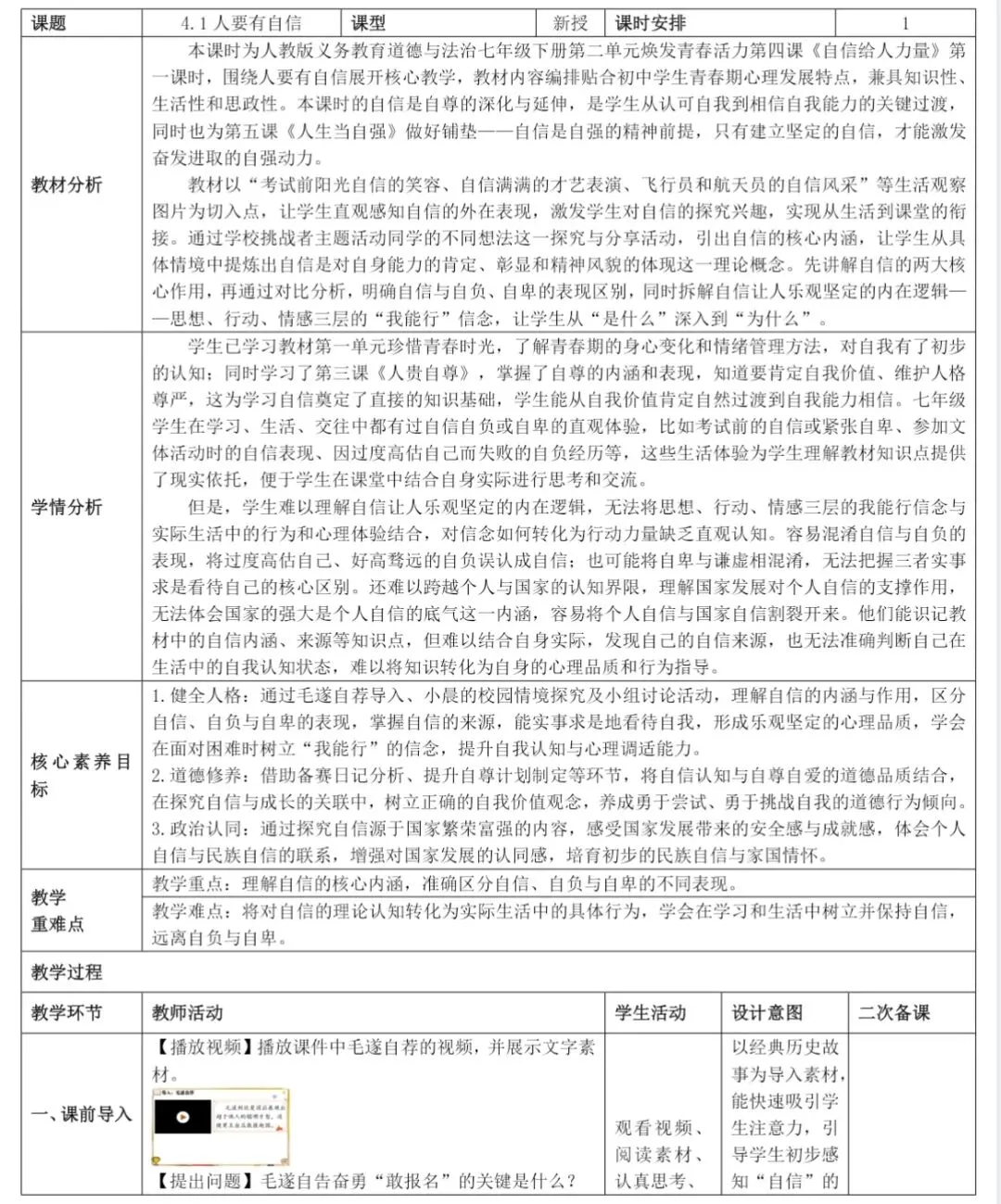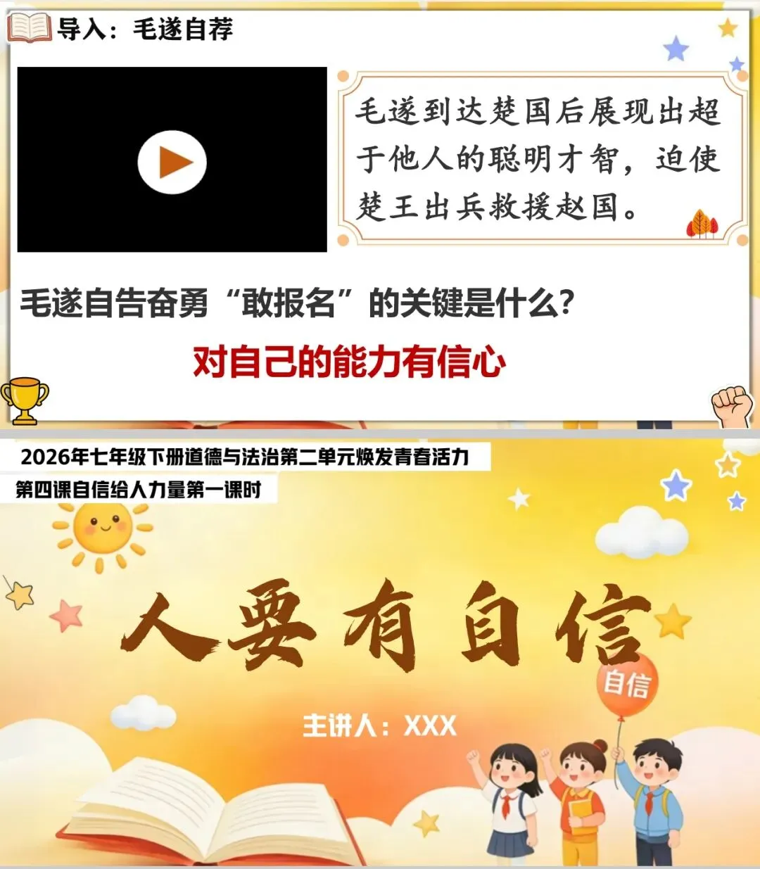 2.导入时,播放毛遂自荐的视频并展示相关文字素材,提出“毛遂自告奋勇敢报名的关键是什么?”的问题,邀请学生回答思考;由此引出本节课的“自信”主题,激发学生学习兴趣。