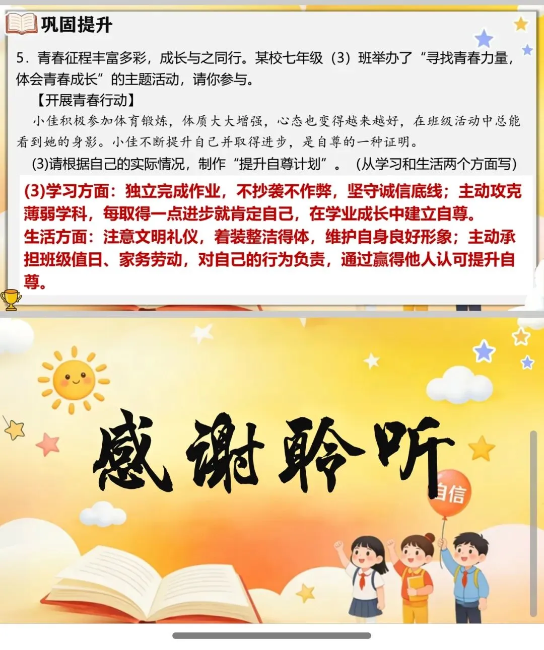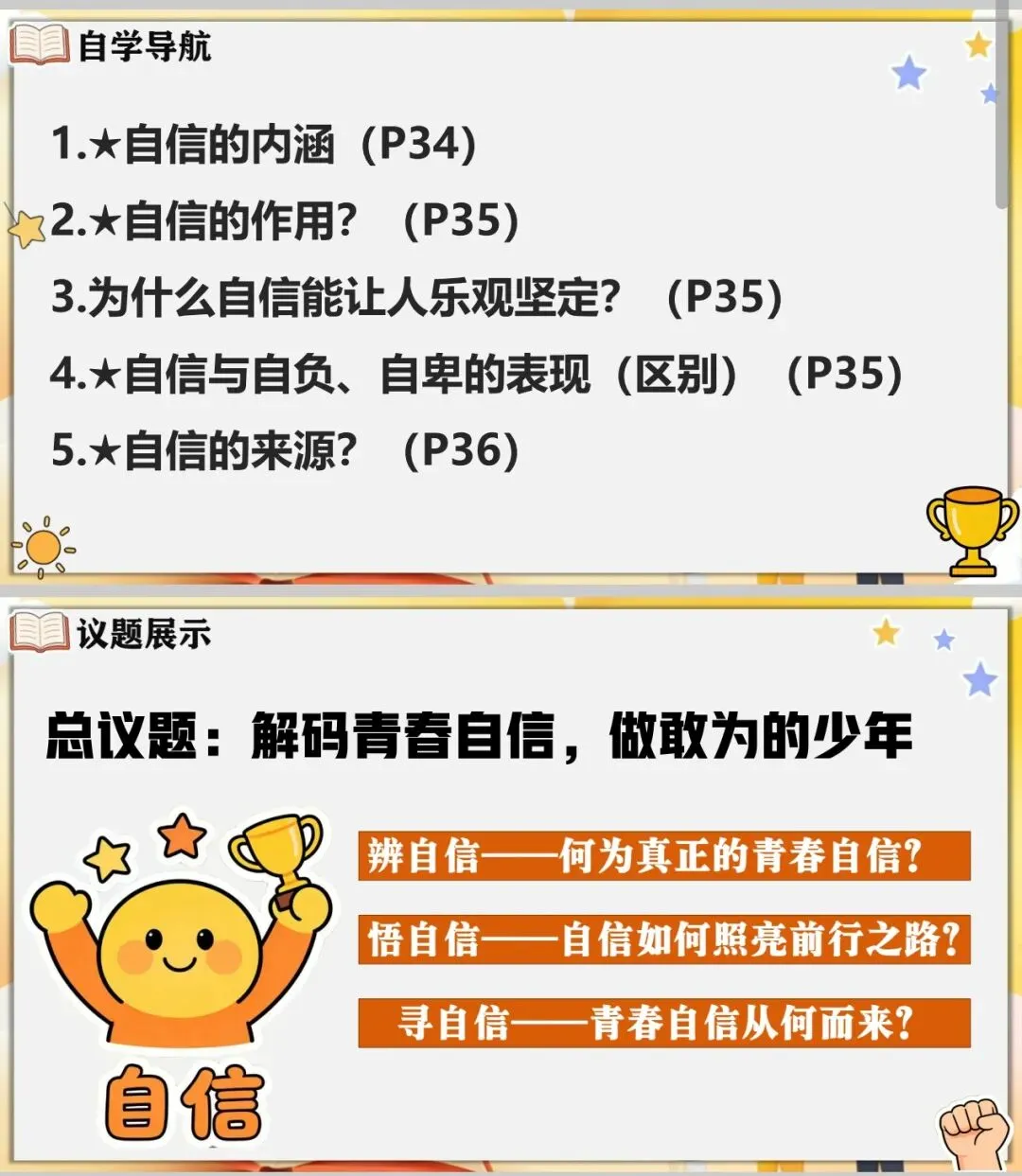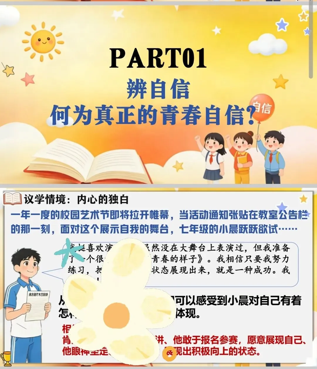 1.课件亮点:本课件贴合七年级学生青春期心理发展特点,以“小晨参加校园艺术节”为连贯主线创设生活化议学情境,将知识探究与小组合作、表格梳理等活动深度结合,兼顾知识性、生活性和思政性。