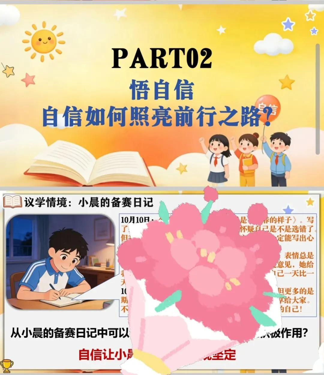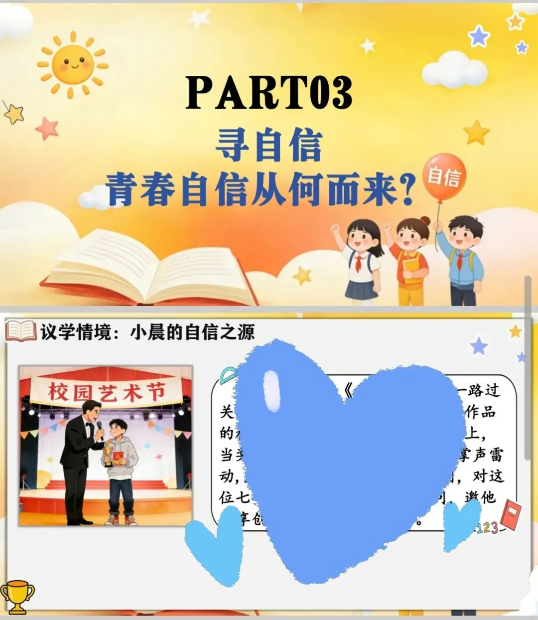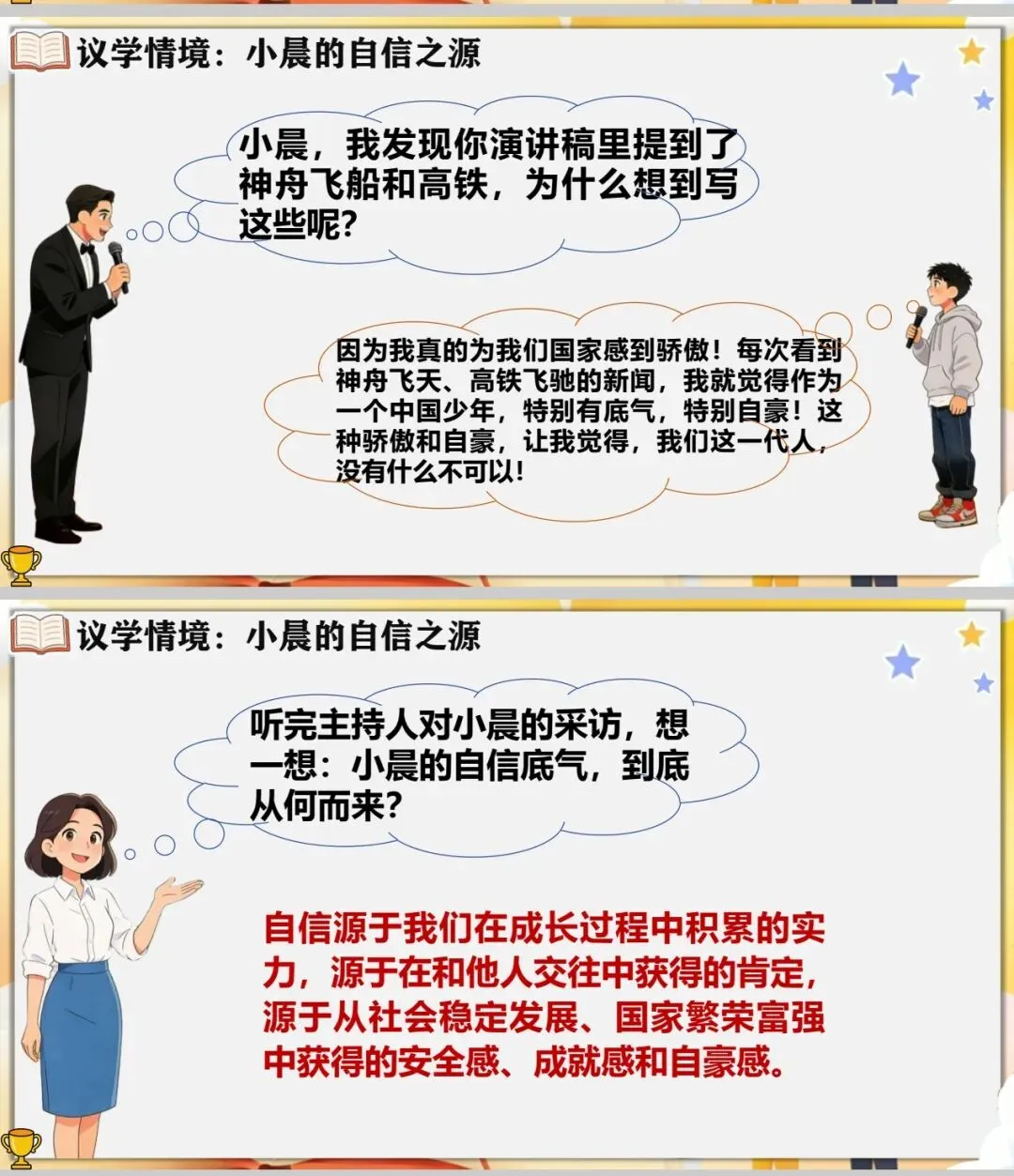 5.在子议题三中,继续深化艺术节情境——小晨在校园艺术节获奖后接受主持人现场采访的情境,展示采访对话和相关文字素材,引导学生思考“小晨的自信底气,到底从何而来?”探究得出自信的来源。