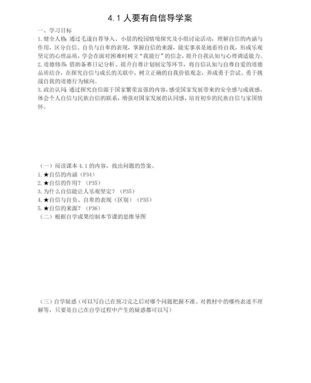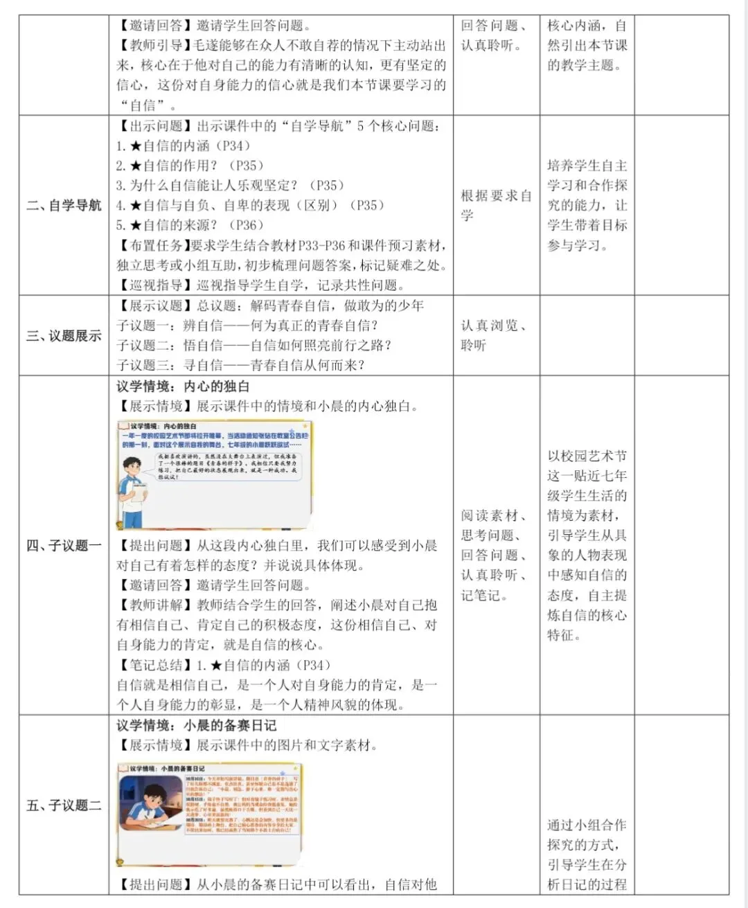 3.在子议题一中,创设小晨参加校园艺术节的内心独白情境,展示相关文字素材,提出“从这段内心独白里,我们可以感受到小晨对自己有着怎样的态度?并说说具体体现”的问题,探究得出自信的内涵。