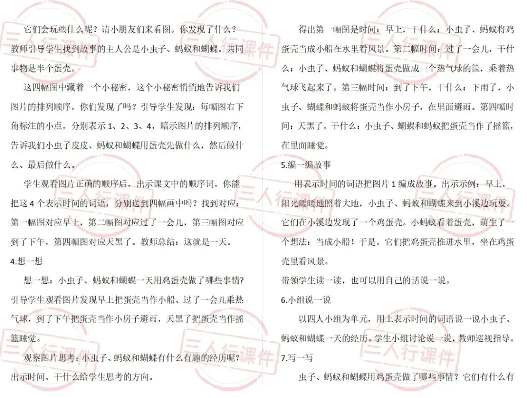 用表示时间的词语把图片1编成故事。出示示例:早上,阳光暖暖地照着大地,小虫子、蚂蚁和蝴蝶来到小溪边玩耍。它们在小溪边发现了一个鸡蛋壳。小蚂蚁看着蛋壳,萌生了一个想法:当成小船!于是,它们把鸡蛋壳推进水里,坐在鸡蛋壳里看风景。