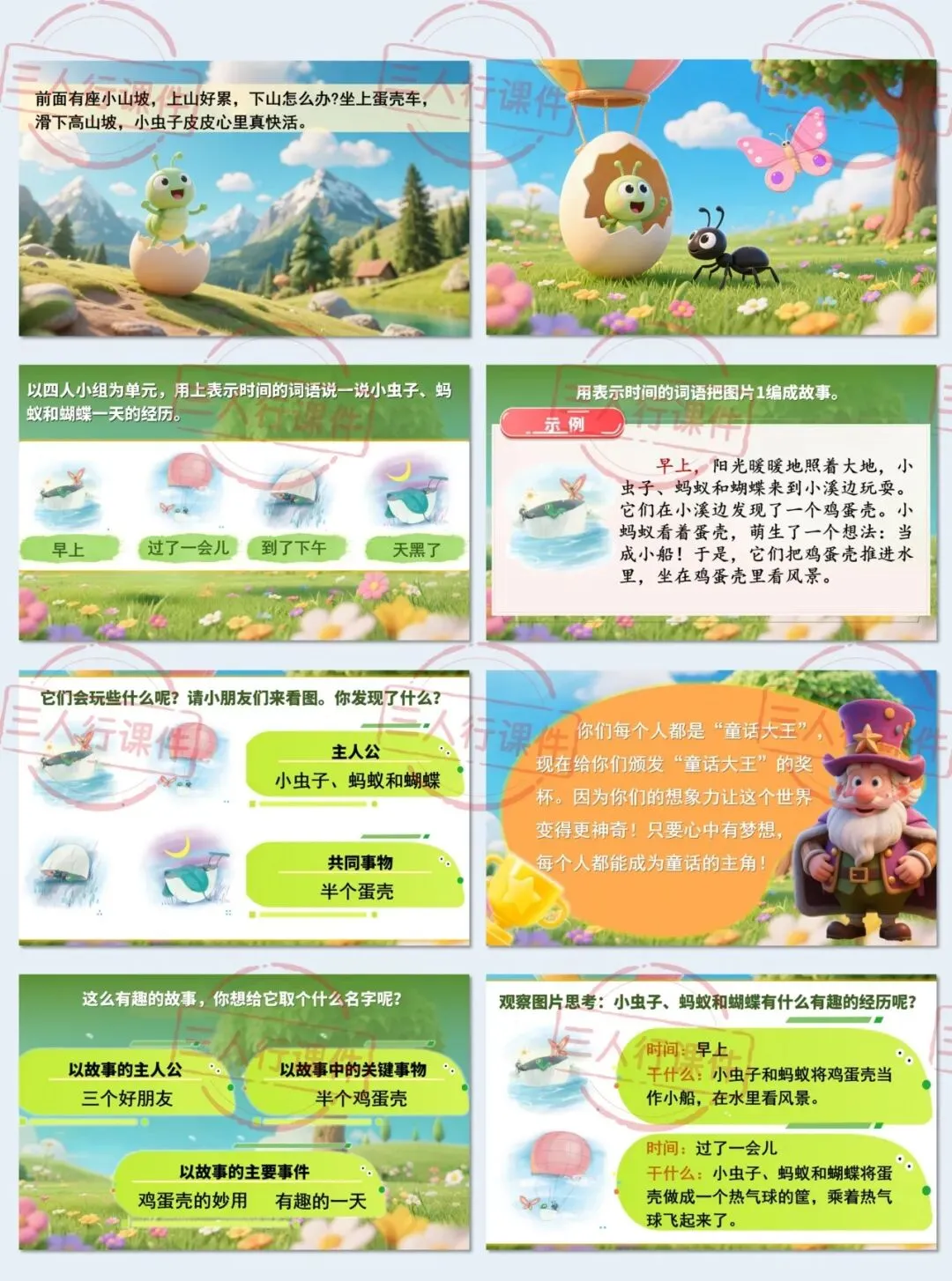 ......它们会玩些什么呢?请小朋友们来看图。你发现了什么?教师引导学生找到故事的主人公是小虫子、蚂蚁和蝴蝶。共同事物是半个蛋壳。