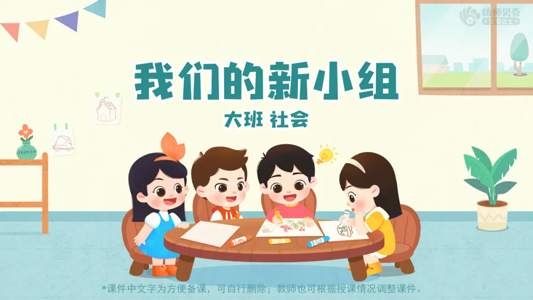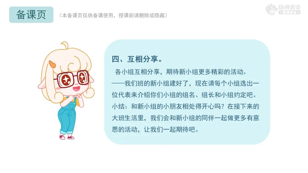 小结:和新小组的小朋友相处得开心吗?在接下来的大班生活里,我们会和新小组的同伴一起做更多有意思的活动,让我们一起期待吧。