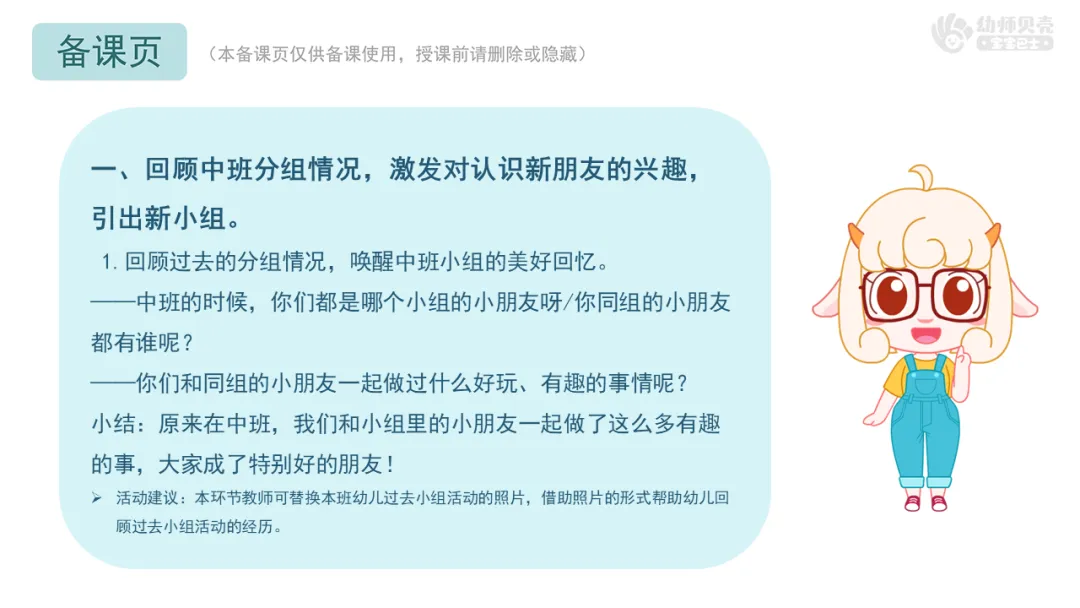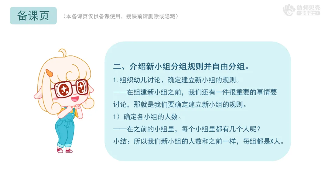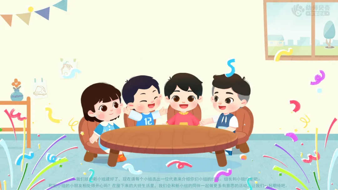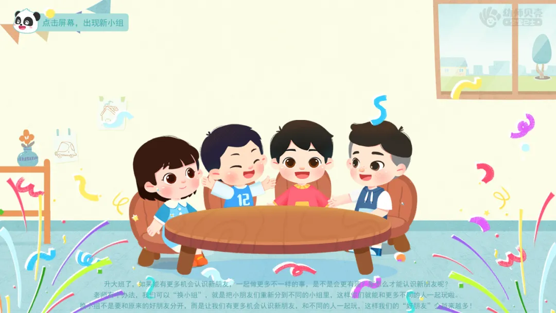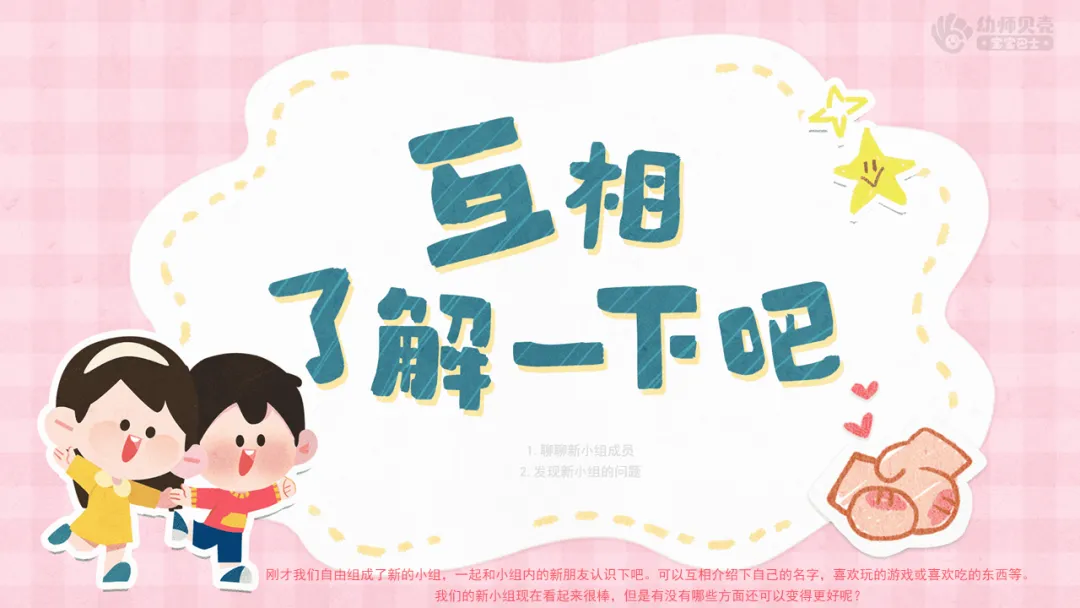 ——刚才我们自由组成了新的小组,一起和小组内的新朋友认识下吧。可以互相介绍下自己的名字,喜欢玩的游戏或喜欢吃的东西等。