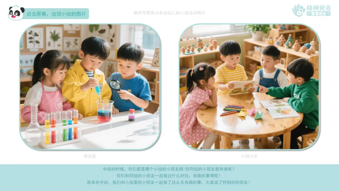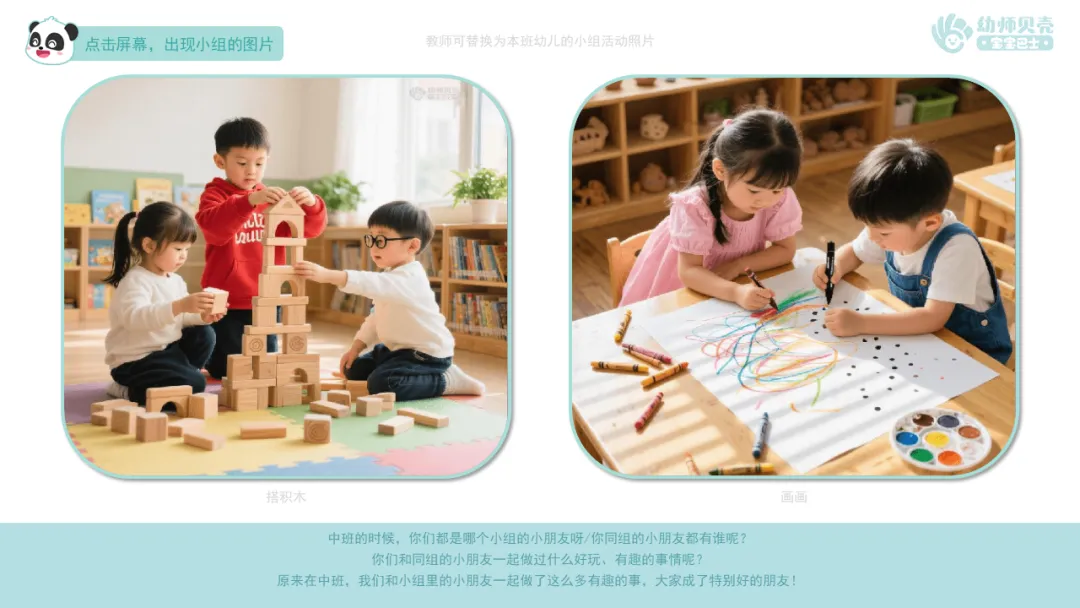 Ø活动建议:本环节教师可替换本班幼儿过去小组活动的照片,借助照片的形式帮助幼儿回顾过去小组活动的经历。