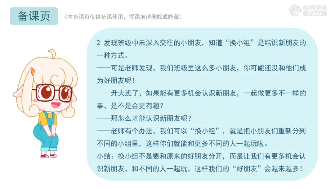 小结:换小组不是要和原来的好朋友分开,而是让我们有更多机会认识新朋友,和不同的人一起玩,这样我们的“好朋友”会越来越多!
