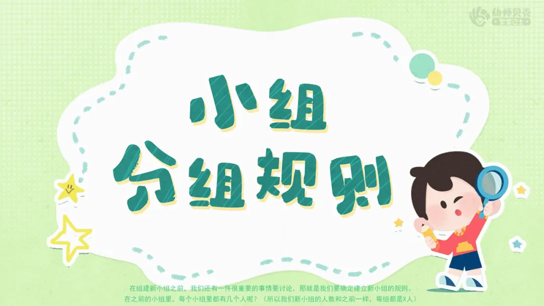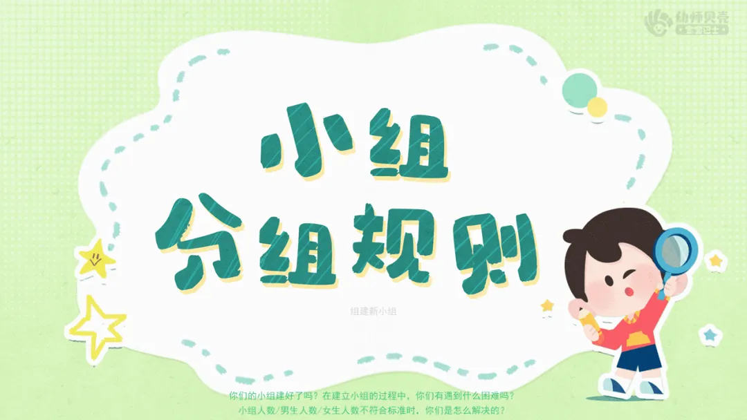 Ø活动建议:根据幼儿实际讨论情况,梳理问题,如小组没有名字,小组没有规则,需要有个小组长等。