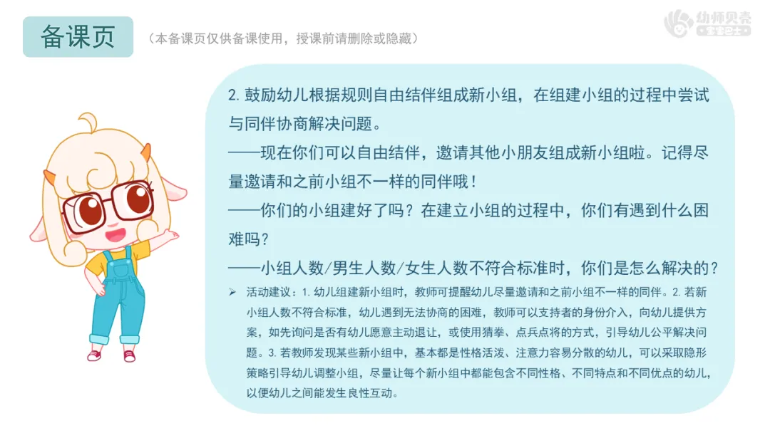 Ø活动建议:1.幼儿组建新小组时,教师可提醒幼儿尽量邀请和之前小组不一样的同伴。2.若新小组人数不符合标准,幼儿遇到无法协商的困难,教师可以支持者的身份介入,向幼儿提供方案,如先询问是否有幼儿愿意主动退让,或使用猜拳、点兵点将的方式,引导幼儿公平解决问题。3.若教师发现某些新小组中,基本都是性格活泼、注意力容易分散的幼儿,可以采取隐形策略引导幼儿调整小组,尽量让每个新小组中都能包含不同性格、不同特点和不同优点的幼儿,以便幼儿之间能发生良性互动。