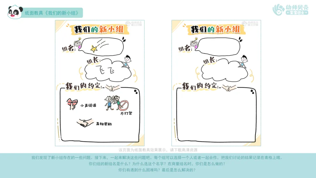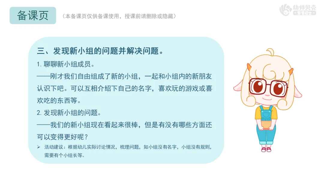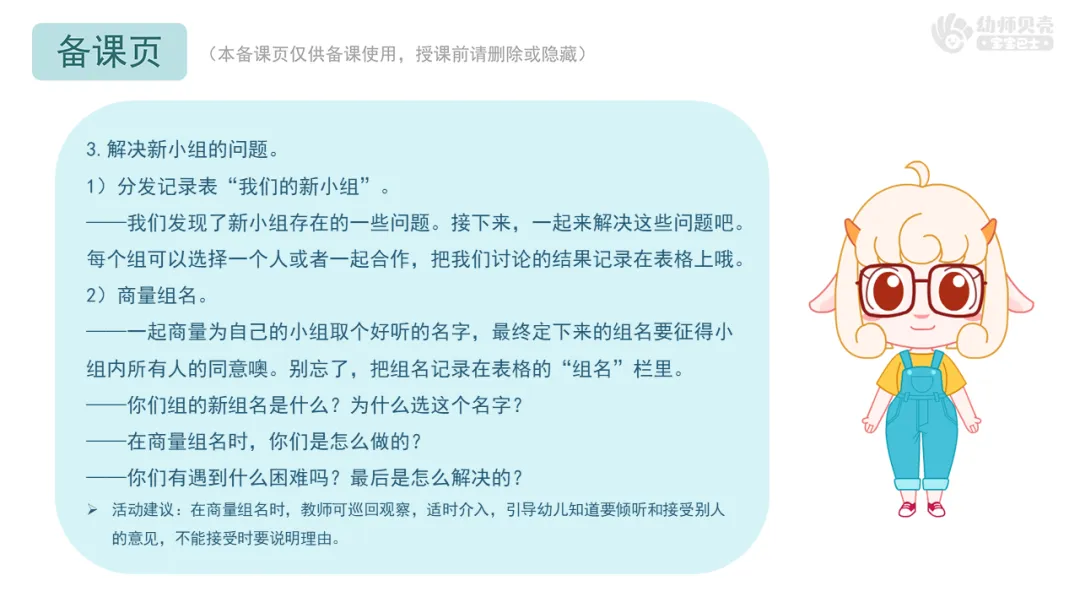 ——我们发现了新小组存在的一些问题。接下来,一起来解决这些问题吧。每个组可以选择一个人或者一起合作,把我们讨论的结果记录在表格上哦。