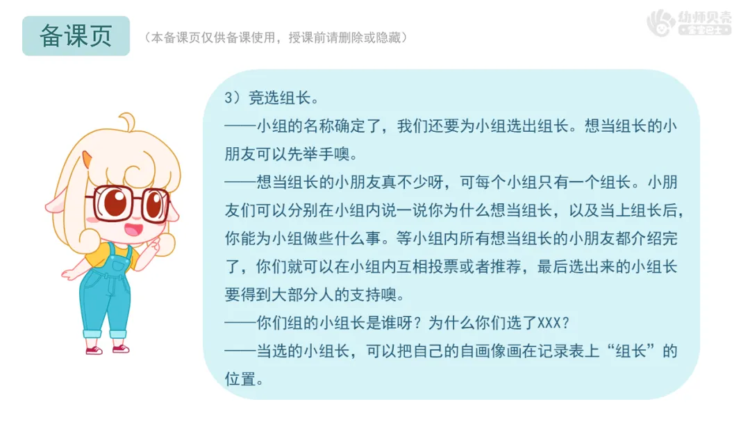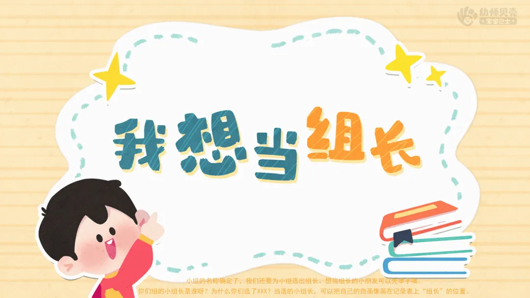 ——想当组长的小朋友真不少呀,可每个小组只有一个组长。小朋友们可以分别在小组内说一说你为什么想当组长,以及当上组长后,你能为小组做些什么事。等小组内所有想当组长的小朋友都介绍完了,你们就可以在小组内互相投票或者推荐,最后选出来的小组长要得到大部分人的支持噢。