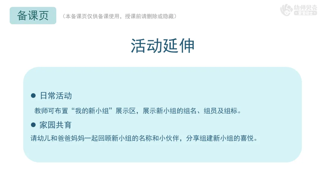 l本活动后,教师可在近期多开展一些需要小组合作的活动或游戏,利于组员之间快速熟悉,培养良好的感情。