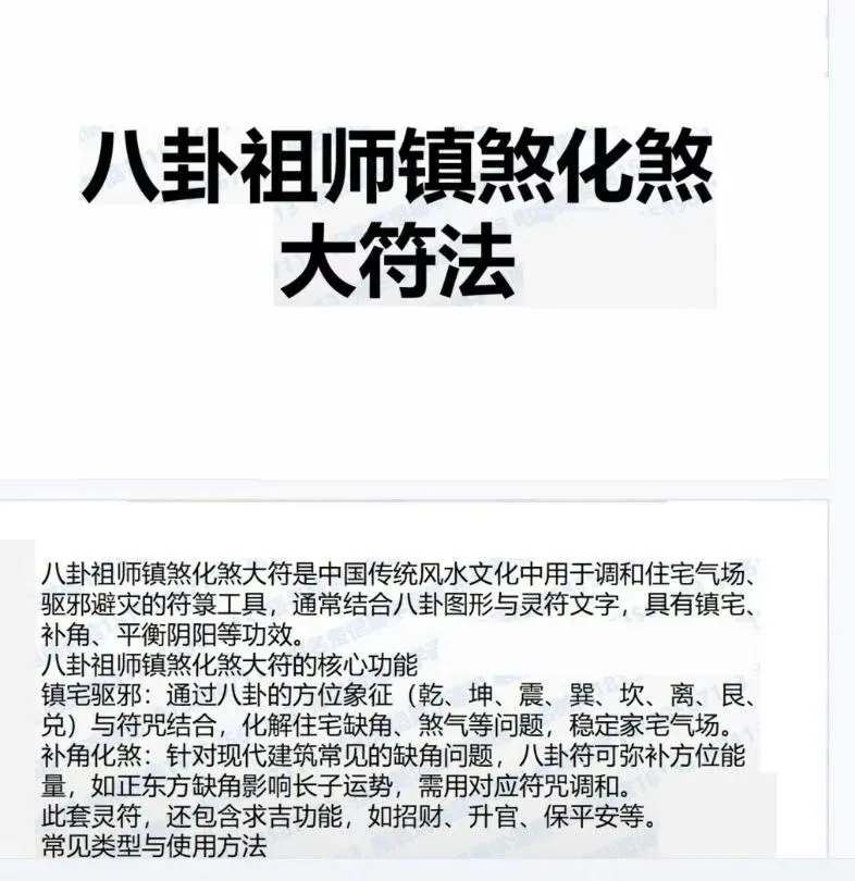 【法术】[玫瑰][玫瑰]八卦祖师镇煞化煞大符法视频+课件 :八卦祖师镇煞化煞大符是中国传统风水文化中用于调和住宅气场、驱邪避灾的符箓工具,通常结合八卦图形与灵符文字,具有镇宅、补角、平衡阴阳等功效。
