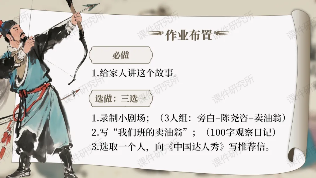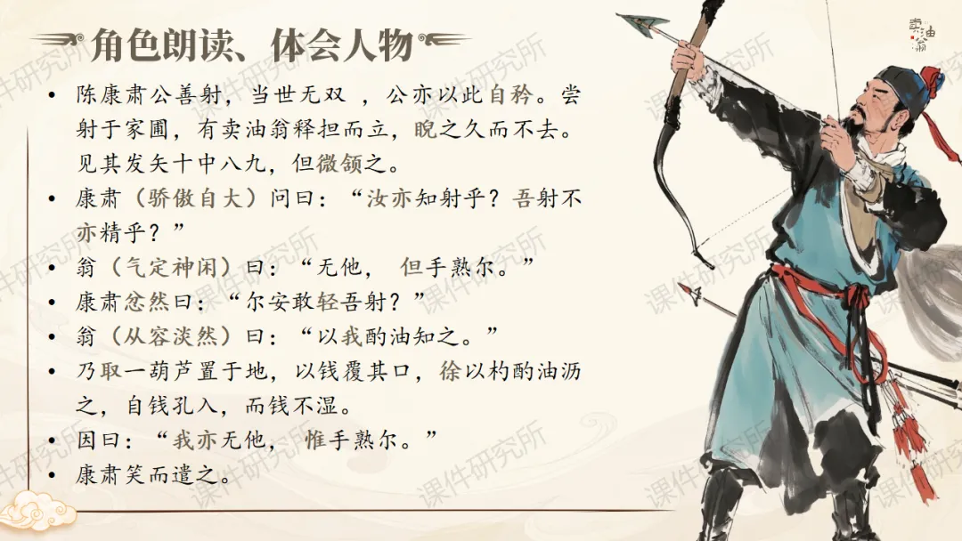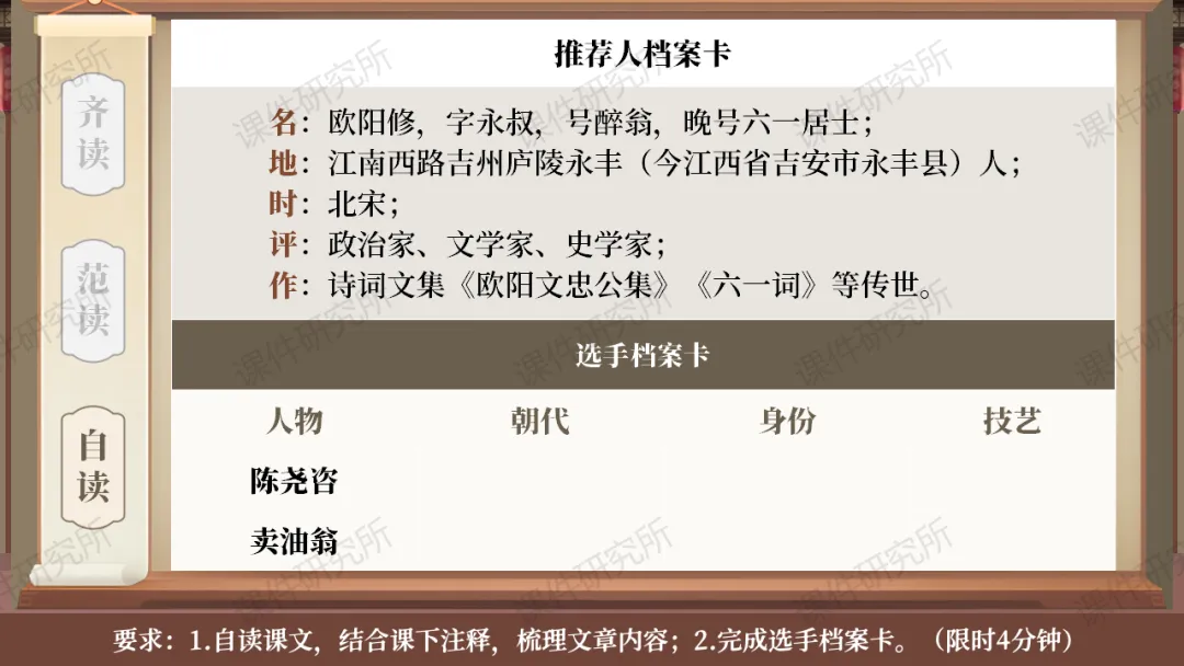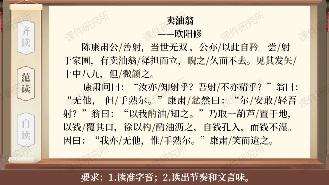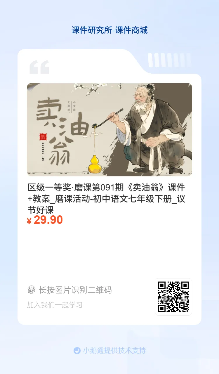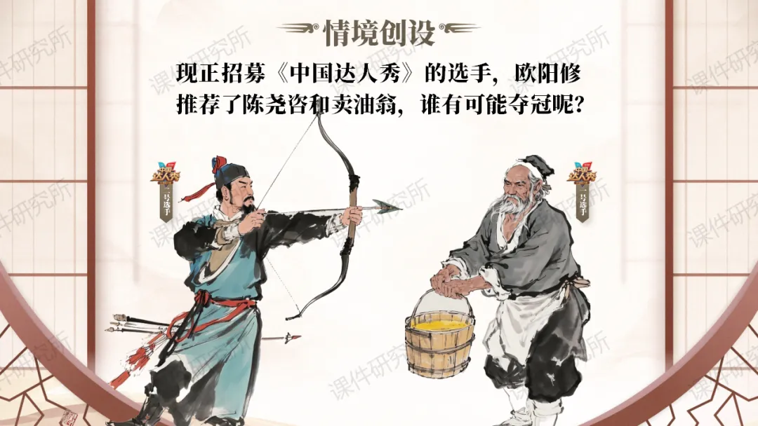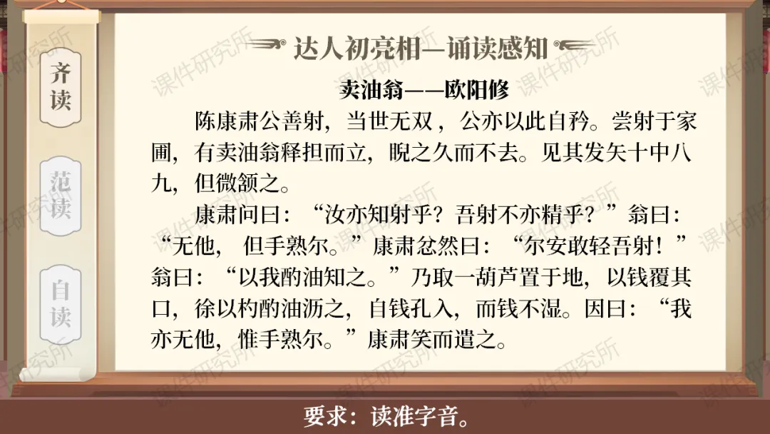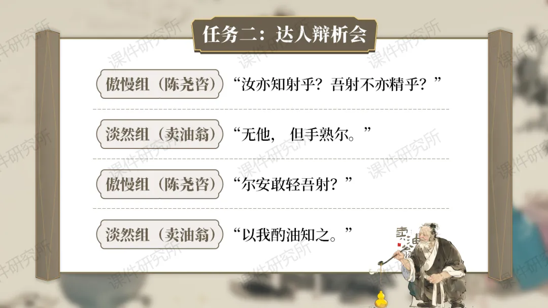 今天分享区级一等奖课件《卖油翁》。老师磨课前已经上过一次这节课,遇到了一些问题,比如时间紧凑,后面的内容来不及上;任务一作为亮点但是对于乡镇学生来说完成有点困难,这一部分花费的时间比较多;学校的指导老师希望能加上作者欧阳修的介绍,怎么加能使环节更顺畅。所以老师希望大家能提供点修改意见。