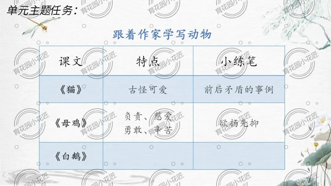 课例最终落脚读写结合,以小练笔实现方法迁移,同时勾连单元内《猫》《母鸡》,构建完整的动物写作方法体系。既落实了字词、朗读等基础目标,又充分凸显学生主体地位,课堂可复制、易落地,是小学中段散文教学的优秀范本。
