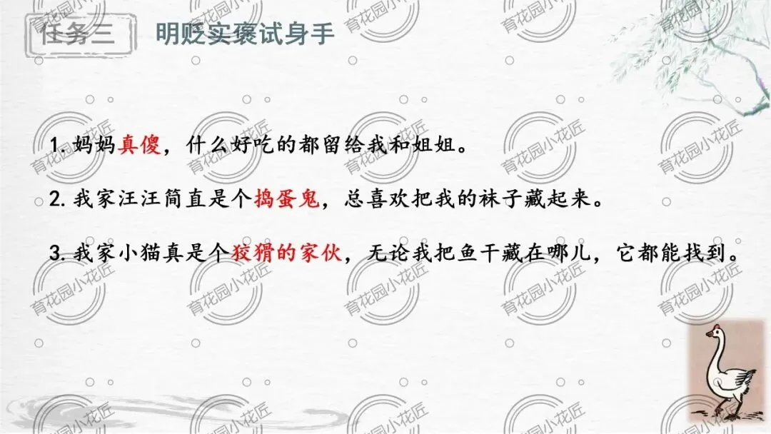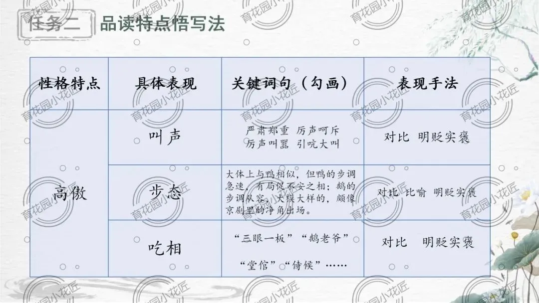 课例以“动物明星风采展示” 情境贯穿始终,设计三大递进式学习任务,从初识白鹅 “高傲” 核心特点,到聚焦吃相、叫声、步态深度品读文本。课堂通过动作模仿、音视频辅助、对比朗读、小组合作等多元形式,破解文本理解难点,精准拆解 “对比、明贬实褒” 的核心写作手法。