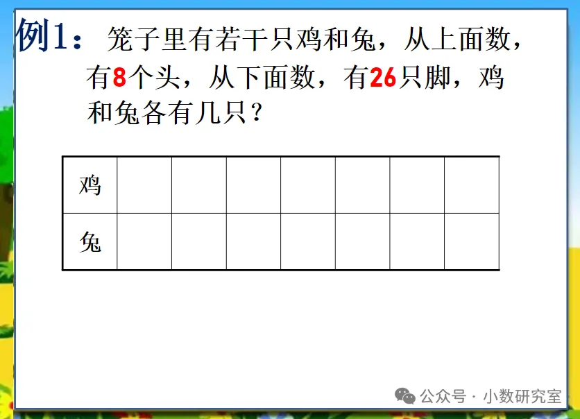 (课件出示例1:笼子里有若干只鸡和兔,从上面数,有8 个头,从下面数,有26 只脚鸡和兔各有几只?)(生读题)