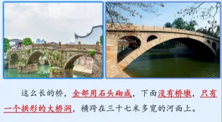 2.小结:是的,同样是全部用石头砌成,但它有三个桥洞,两个桥墩支撑着桥身,而我们的赵州桥——下面没有桥墩,只有一个拱形的大桥洞,横跨在三十七米多宽的河面上。