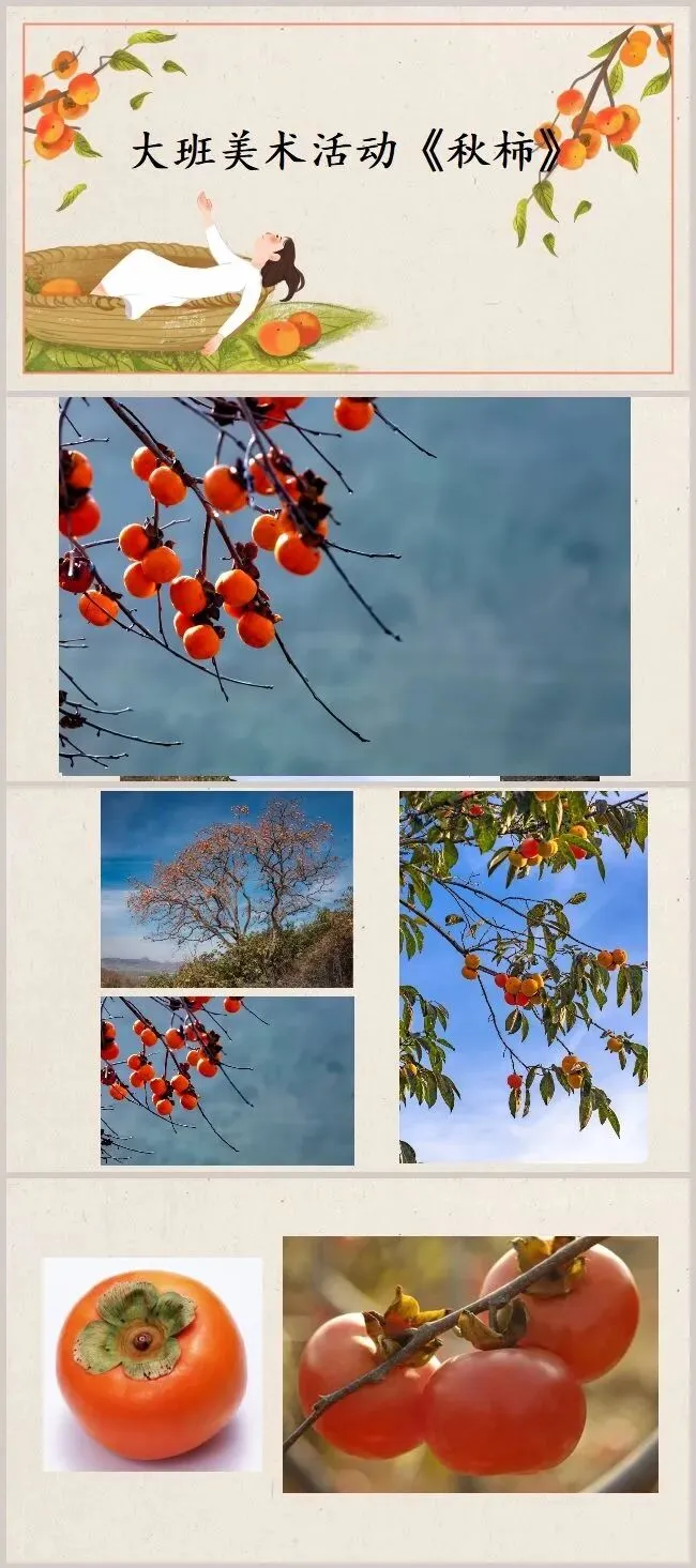 物质准备:实物柿子、柿子树不同景象的图片、水粉颜料、排笔、拓印海绵、抹布、作品底板若干;《金秋序曲》背景音乐。