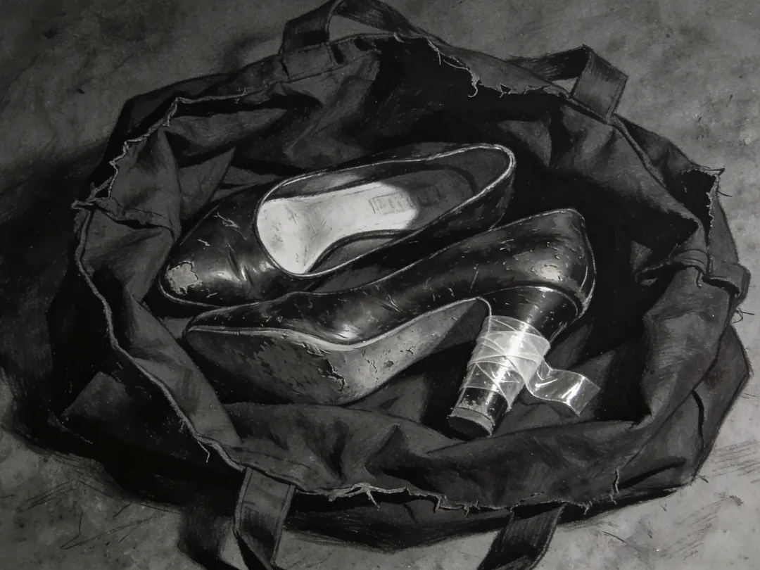 柜子里空空如也,除了最底层,有一个不起眼的黑色布包。我把它拿出来,打开一看,里面是一双黑色的高跟鞋,鞋跟处缠着一圈胶布,似乎是为了防止磨损地面。我的手开始颤抖,这鞋……这鞋……