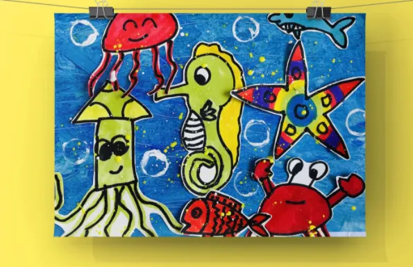 六、美工活动----变废为宝。幼儿运用多种美工材料动手制作,共同装饰展板,布置美丽的海底世界。