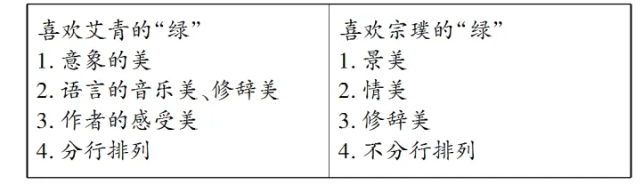 绿是生命的象征,诗中的“绿”让读者阅读后倍感舒适,体验到美好的情感。现代作家中,宗璞写过《西湖漫笔》一文,取材也是大自然中的绿,引导学生比较两者的不同。