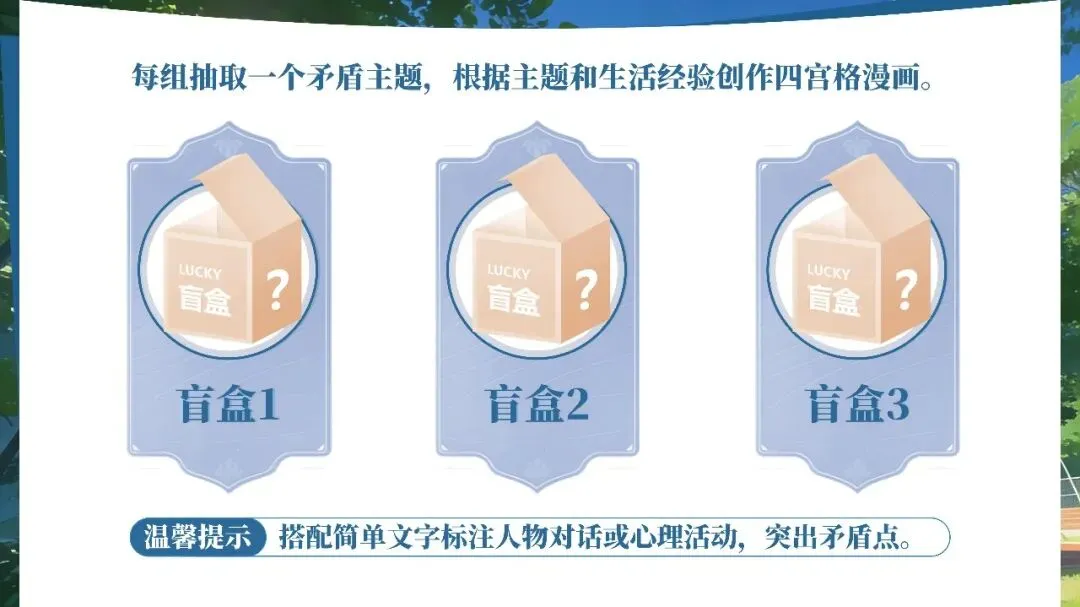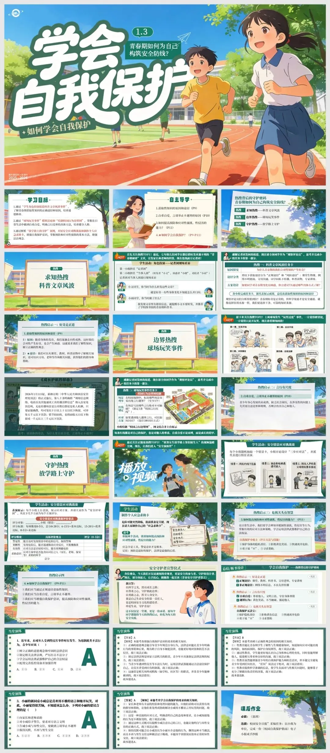 课件充分考虑初一学生青春期特点,设计有“青春期画作”、“主题辩论”、“盲盒漫画创作”等趣味活动,兼顾个人独立思考与团队协作探究,助力学生积极正视困惑与烦恼,从容迎接成长。
