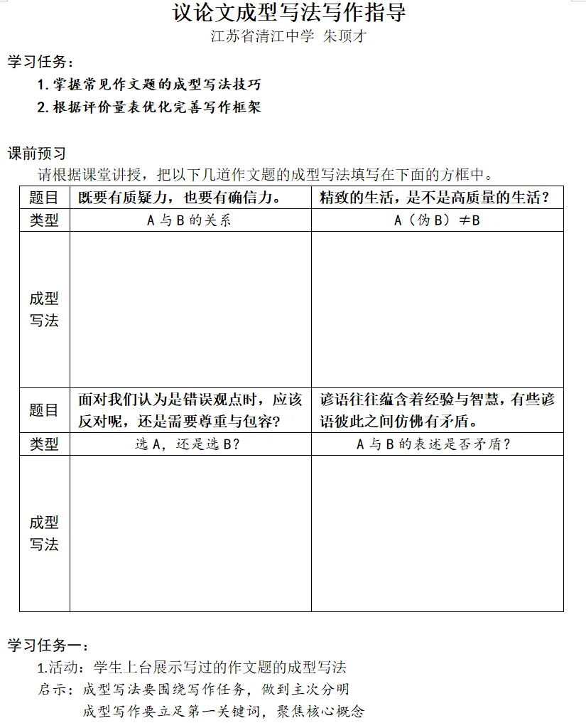 朱顶才,毕业于扬州大学,教育学硕士,全国模范教师,“淮安市‘533’工程拔尖人才 培养对象”,“淮安市高中语文学科带头人”。就职于江苏省清江中学,为“陈淮高教育名师工作室”核心成员。现为江苏省青少年作家协会理事。近三年发表写作类指导文章 60 余篇, 参编《治病救“文”》《改出好作文》等作文指导用书多本。