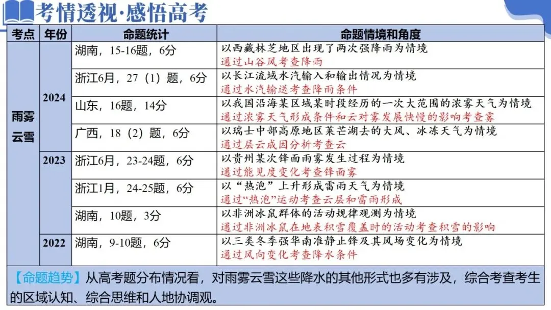 【命题趋势】从高考题分布情况看,对雨雾云雪这些降水的其他形式也多有涉及,综合考查考生的区域认知、综合思维和人地协调观。 |