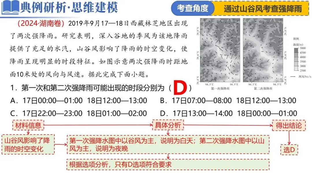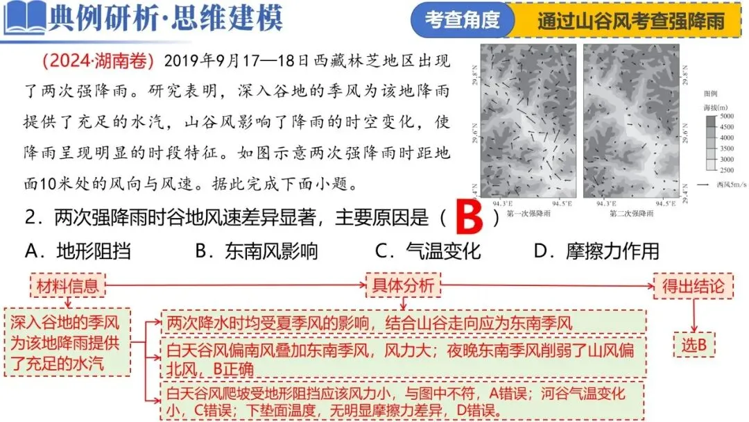 雨雾云 | 2024 | 湖南,15-16题,6分 | 以西藏林芝地区出现了两次强降雨为情境 通过山谷风考查降雨 |