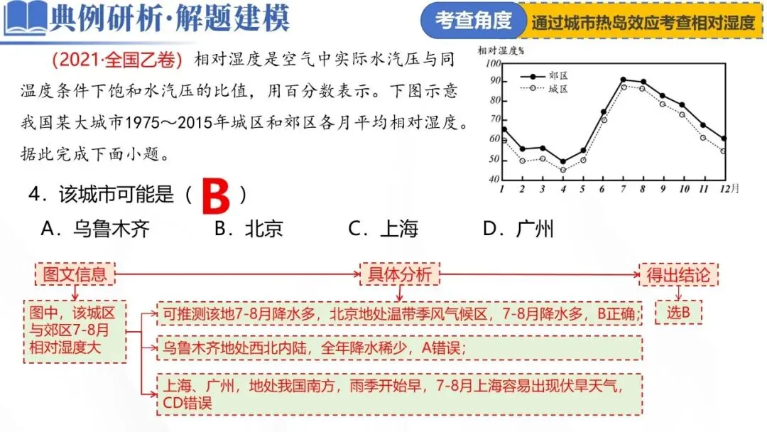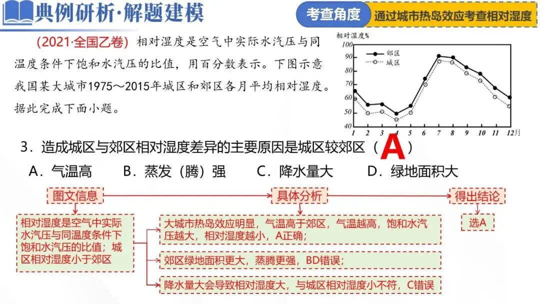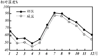 (2021·全国乙卷)相对湿度是空气中实际水汽压与同温度条件下饱和水汽压的比值,用百分数表示。下图示意我国某大城市1975~2015年城区和郊区各月平均相对湿度。据此完成下面小题。