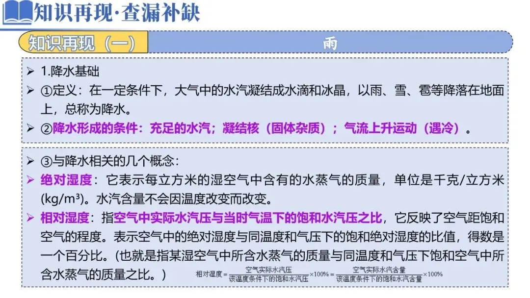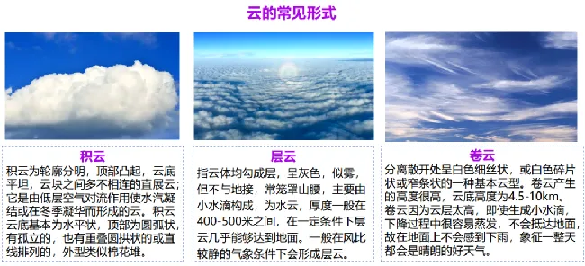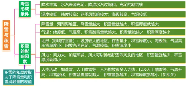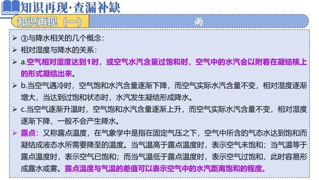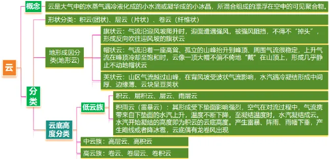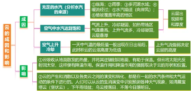 ②降水形成的条件:充足的水汽;凝结核(固体杂质);气流上升运动(遇冷)。