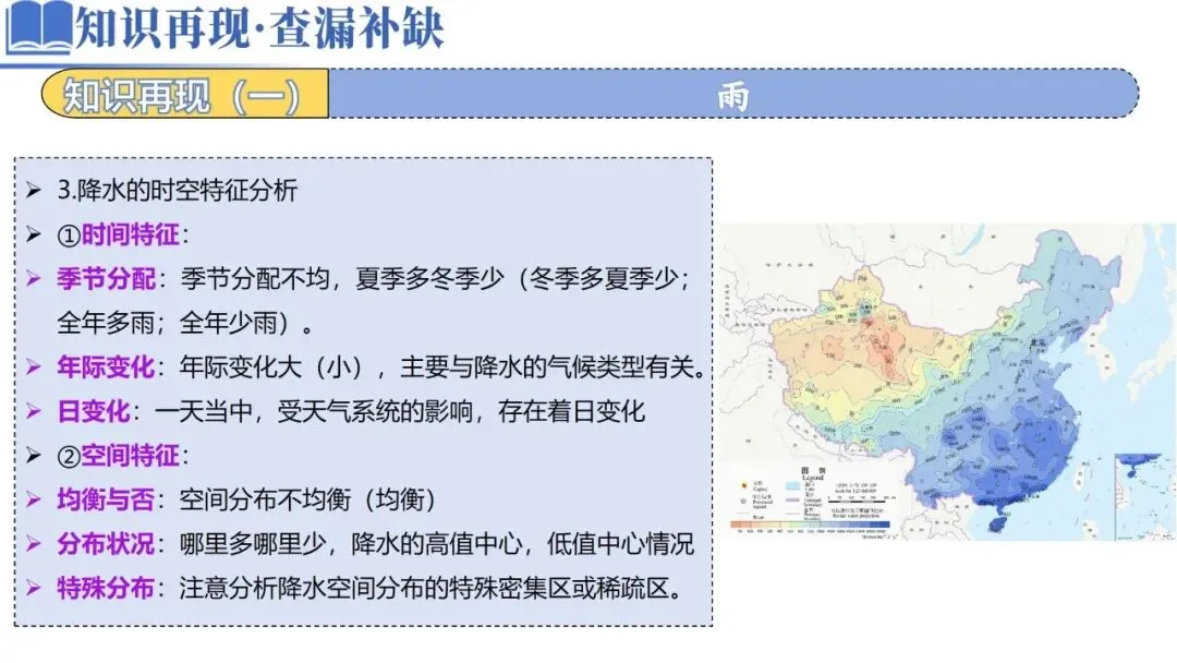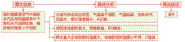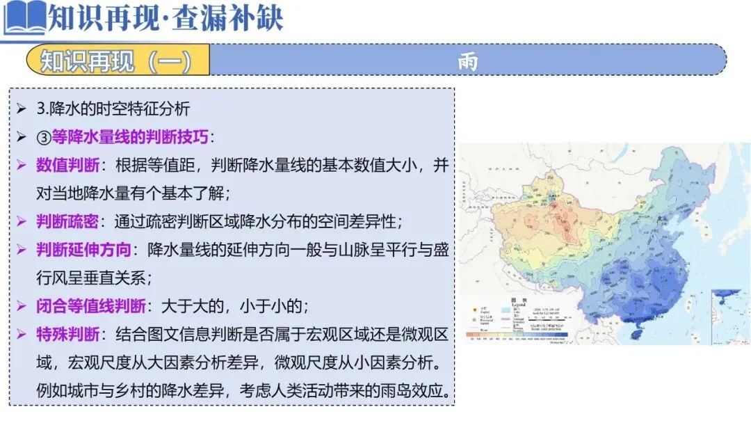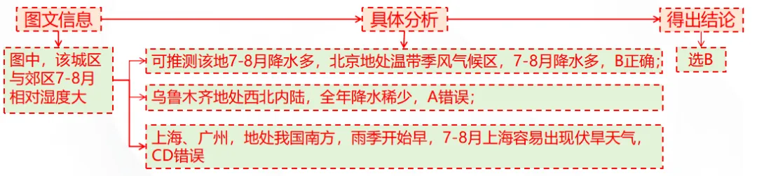 特殊判断:结合图文信息判断是否属于宏观区域还是微观区域,宏观尺度从大因素分析差异,微观尺度从小因素分析。例如城市与乡村的降水差异,考虑人类活动带来的雨岛效应。