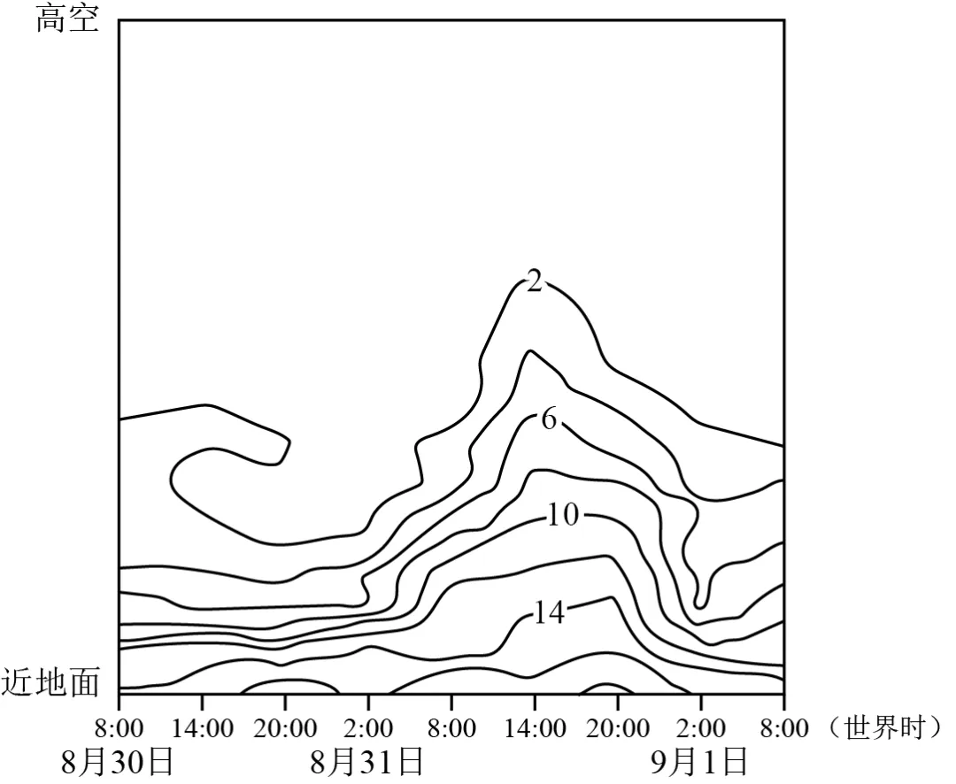2.降雨时近地面相对湿度升高,A错误;8月31日8:00至20:00,降雨量大,比湿变大并向高空延伸,B正确,C错误;暴雨时近地面以上升气流为主,D错误。故选B。