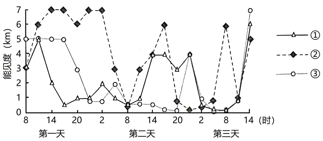 (2023·浙江6月选考)贵州中西部地区冬季多出现水平能见度小于1千米的锋面雨雾,雾区位于锋线附近。下图为贵州某次锋面雨雾发生过程中,大致呈纬向分布的三个测站测得的能见度变化图。这次雨雾形成的气象条件是西南气流沿锋后弱冷平流爬升,形成弱降水。雨雾随锋面缓慢东移消亡。完成下面小题。