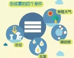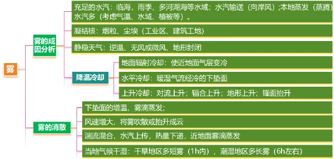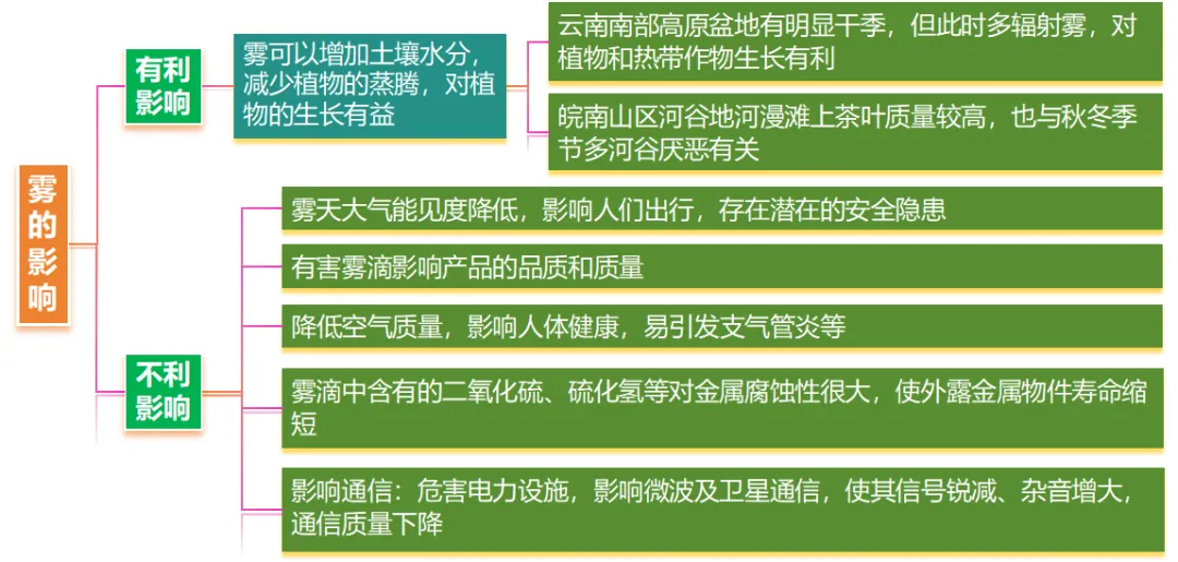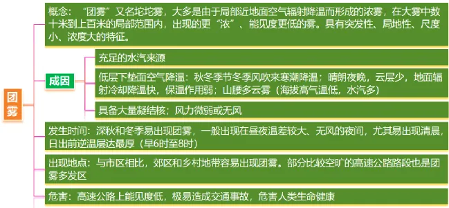 锋面雾 | 我国江淮一带梅雨季节常常出现锋面雾 | 发生于锋面附近,暖气团的降水落入冷空气层时,冷空气因雨滴蒸发而达到过饱和,水汽在锋面底部凝结而成 |