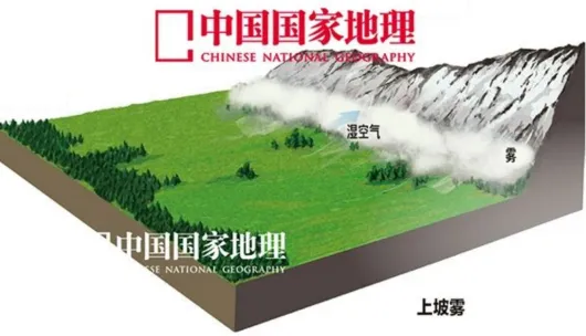 上坡雾 | 在青藏高原、云贵高原的东部 | 潮湿空气沿山坡上升冷却,水汽凝结而产生的雾 |