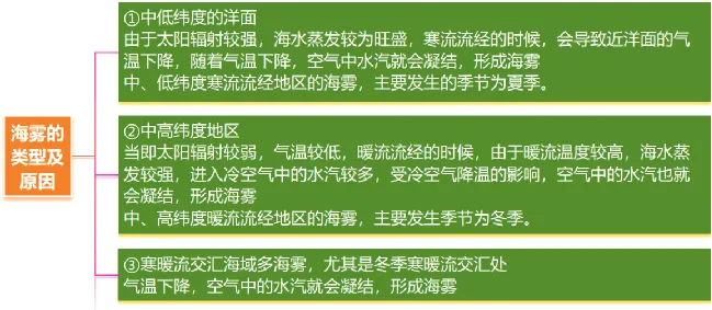平流雾 (海雾) | 寒流经过的洋面 | 春季和夏冬季节的早晨,例如我国沿海春夏季节的海雾;寒流流经的中低纬海域洋面上的雾(夏季更明显) | 温暖潮湿的空气经过冷的海面或陆面,低层空气遇冷水汽凝结而成 |