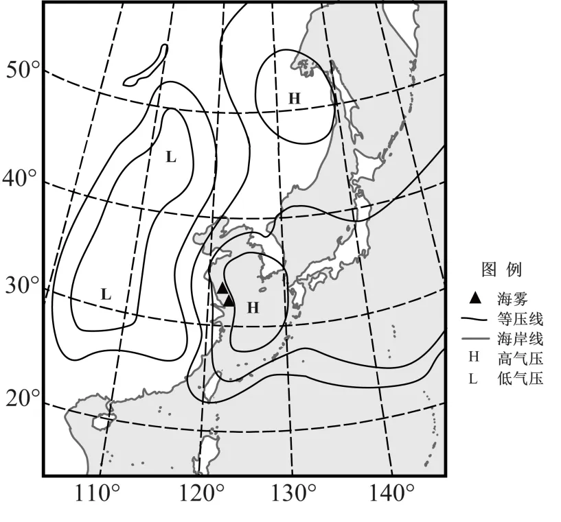 我国近海地区常出现海雾,其中黄海是海雾发生最为频繁的海区。黄海海雾在每年3月开始逐渐增多,4~7月是高发月份,8月之后海雾明显减少。下图示意黄海西海域一次较浓重海雾形成时的天气状况。完成下面小题。