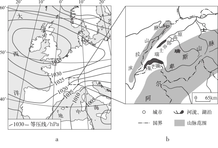 图a示意欧洲部分区域一种典型的海平面气压分布形势。冬季受该气压形势控制时,瑞士中部高原地区(图b)风速较大,最大风速位于莱芒湖区,时速可超过100千米。这种风会使瑞士中部高原地区出现逆温层,逆温层下方常有层云(低空中呈层状的云层)形成;当有其他条件配合时,莱芒湖畔局地还容易出现冰冻现象。右图为莱芒湖畔某次发生冰冻时的街景。