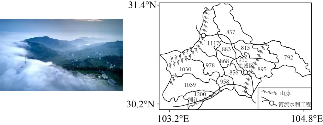 “云瀑”是云顺风向翻过山岭后向低处倾泻成瀑布状的奇特天气现象。我国四川省成都市蒲江县得益于地形、气候条件,常能观赏到云瀑景观。下图为云瀑景观及成都各区市县多年平均降水量分布示意图,读图,完成下面小题。