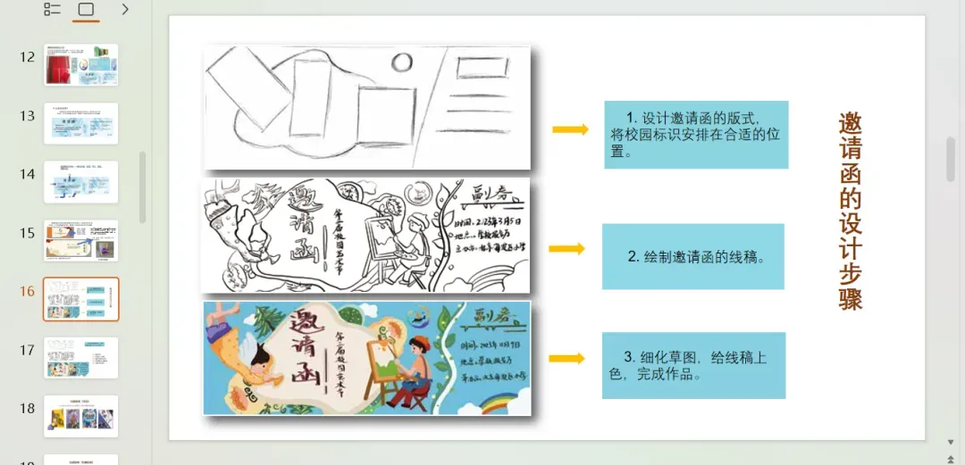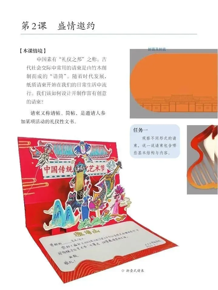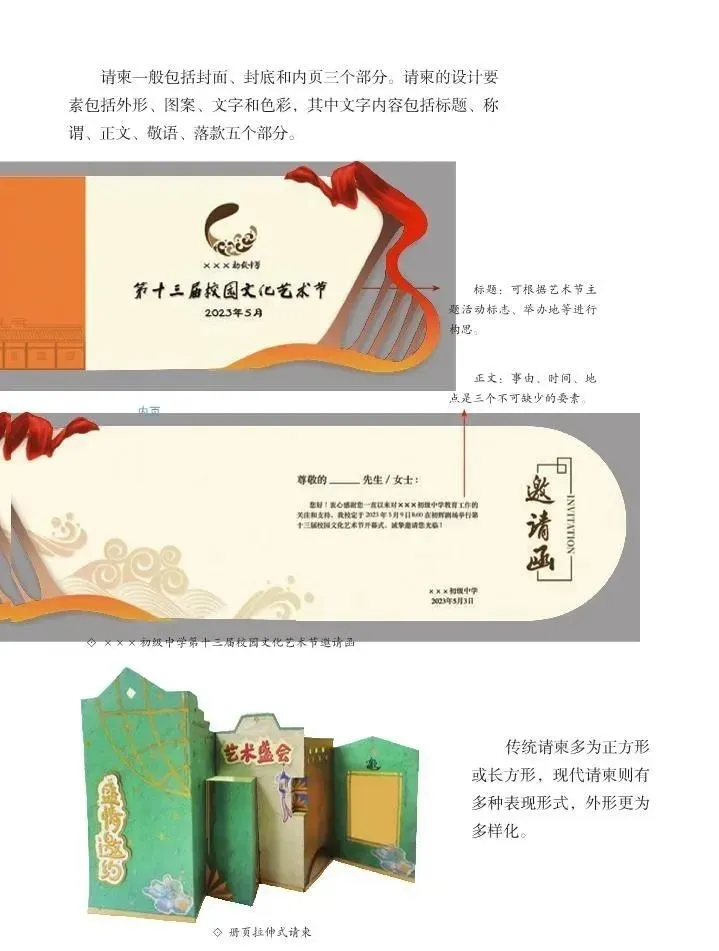 艺术表现:学习请柬的设计要素及基本折叠形式,结合校园艺术节,设计一张造型独特的请柬。