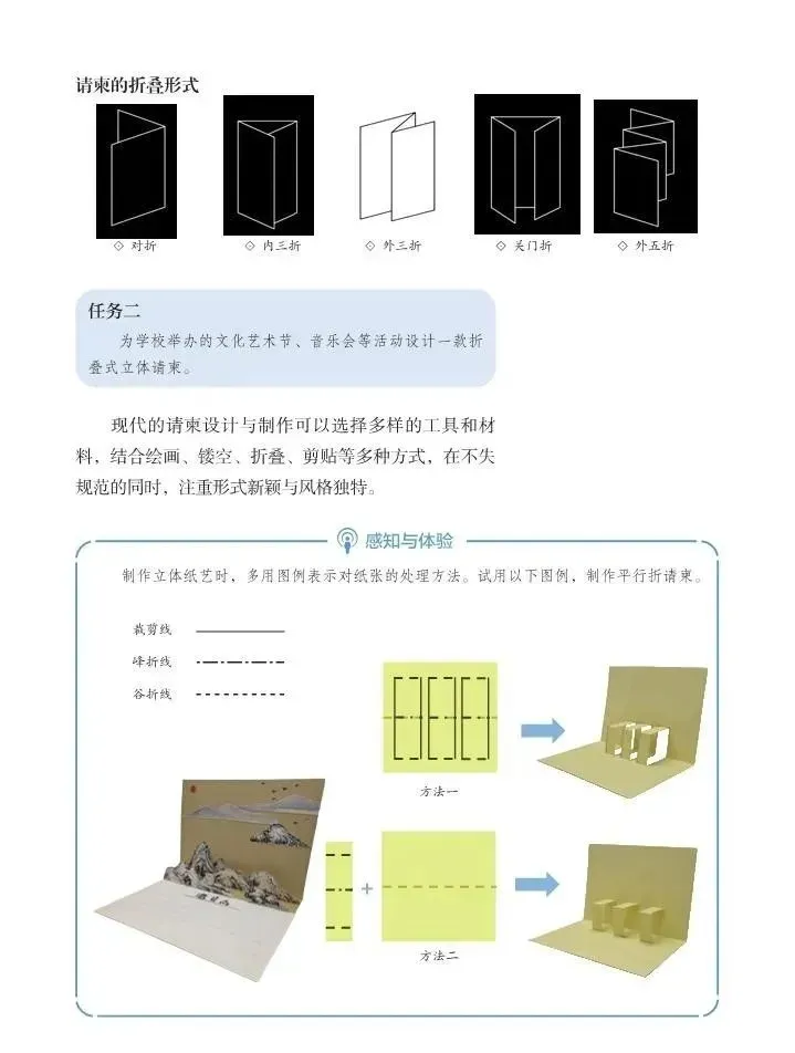 重点:请柬的结构与设计要素;平行折技法的操作步骤。学习请柬的设计要素与特点,设计富有创意的艺术节请柬。学习运用平行折制作请柬的立体效果,规范请柬内文的书写格式。