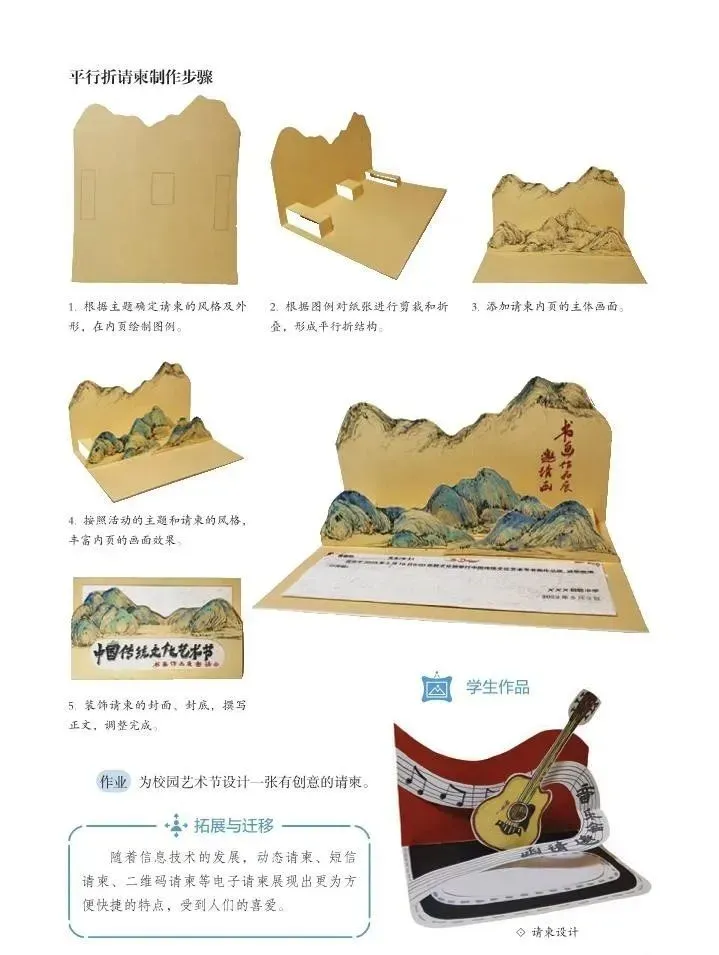 创新实践:学会运用平行折技法制作立体折叠请柬,尝试结合绘画、镂空等装饰手法。制作校园艺术节立体请柬。