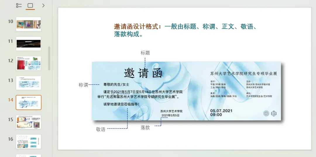 以“校园艺术节请柬”为例,标注各部分的文字内容(如时间、地点、事由)。
