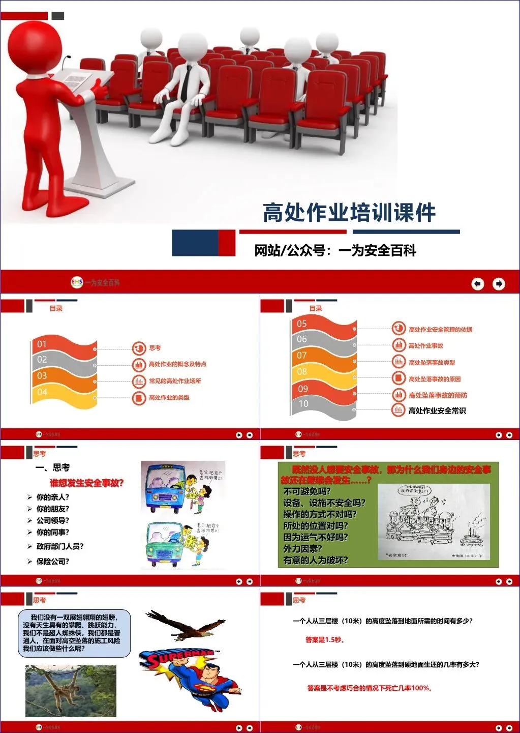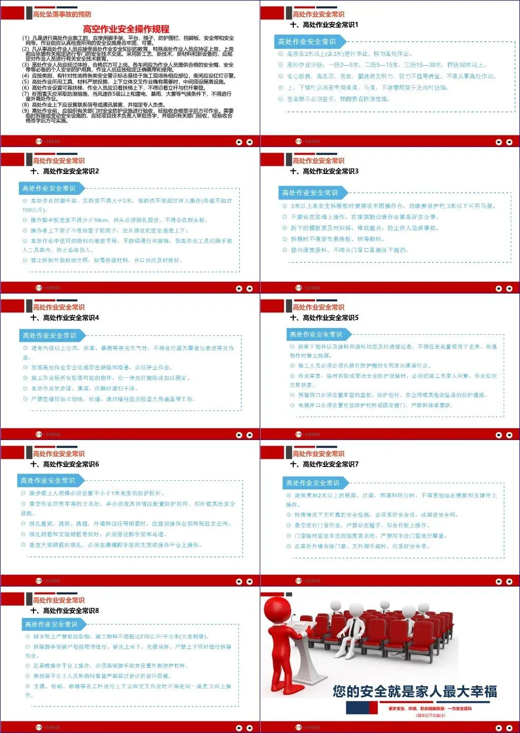 该文档《高处作业安全培训课件》系统全面地介绍了高处作业相关的安全知识体系,旨在提升从业人员的安全意识与操作规范性。内容首先从“思考”切入,通过设问引发对事故频发原因的反思,并用数据强调高处坠落的致命性(如10米坠落仅需1.5秒、生还率极低),突出预防的紧迫性。