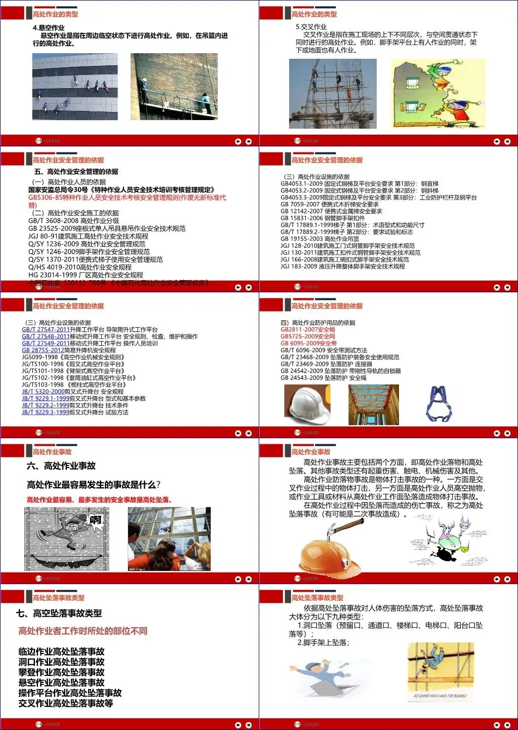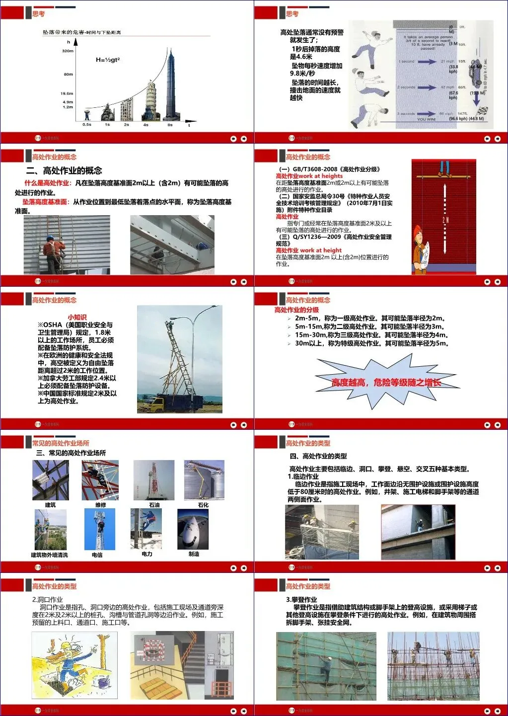 常见的高处作业场所包括建筑维修、石油石化、外墙清洗、电力电信及制造业等。作业类型主要涵盖五类:临边作业、洞口作业、攀登作业、悬空作业和交叉作业,每类均配有典型场景说明。
